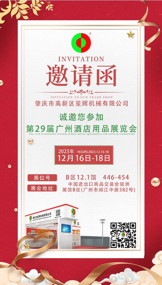 2023年第29屆廣州酒店用品展覽會,將于2023年12月16日-18日在中國進出口商品交易會琶洲展館(廣州市海珠區閱江中路380號)舉行,誠邀新老客戶屆時蒞臨我司展位參觀交流洽談!